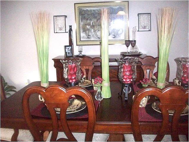 | Homeowner art on the wall was a must keep and remember no paint on the walls. We had to bring in color with the accessories on the table and the hutch. |